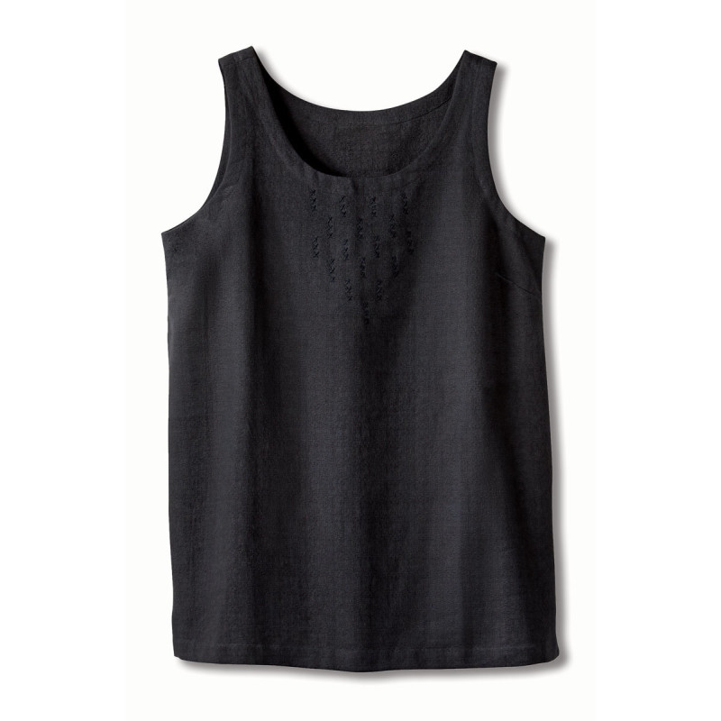 Our favorite woven tank top now in a new cotton fabric with a great texture and cool weather weight. The basic black top has side slits for an easy sweep. Tone-on-tone hand embroidery embellishments. Ready to wear alone or layered.