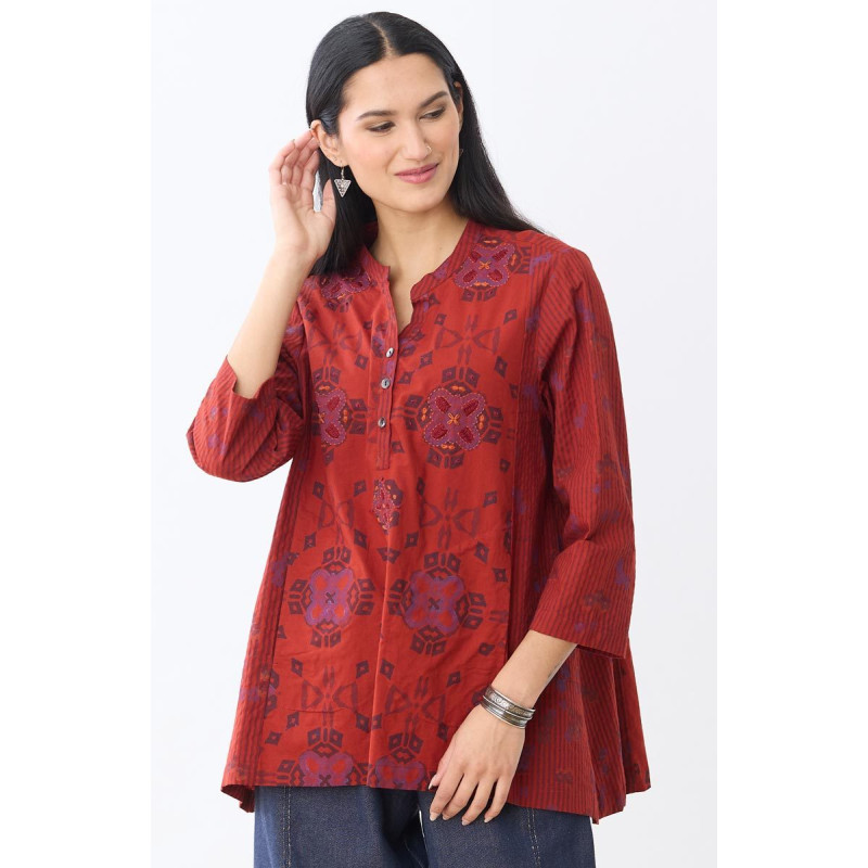 Riyana Organic Cotton Henley Tunic - Sunset red/Multi