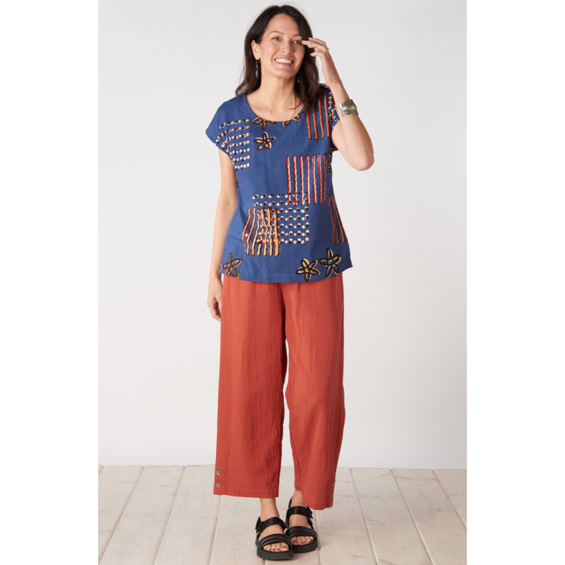 Our versatile straight leg pant in fiery red soft double gauze with a button detail at the hem. The flood length pull-on style sits at natural waist with an easy fit through hip and thigh. Tonal hand embroidery accents.