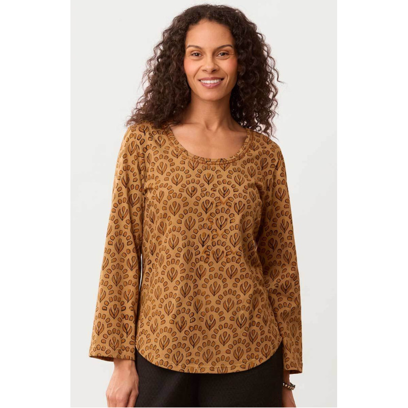 Dark gold handprint on golden jersey, this soft blockprinted scoop neck knit top is ready to wear alone or pair with a vest or jacket. Tonal hand embroidery outlines the neckline.