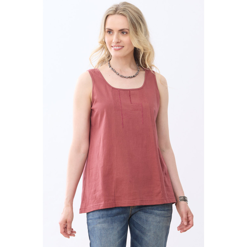 Soft pale red jersey tank top with tone-on-tone hand embroidery on the center panel. The lightweight knit tank is ready to wear alone or layer under your favorite tunic or jacket.