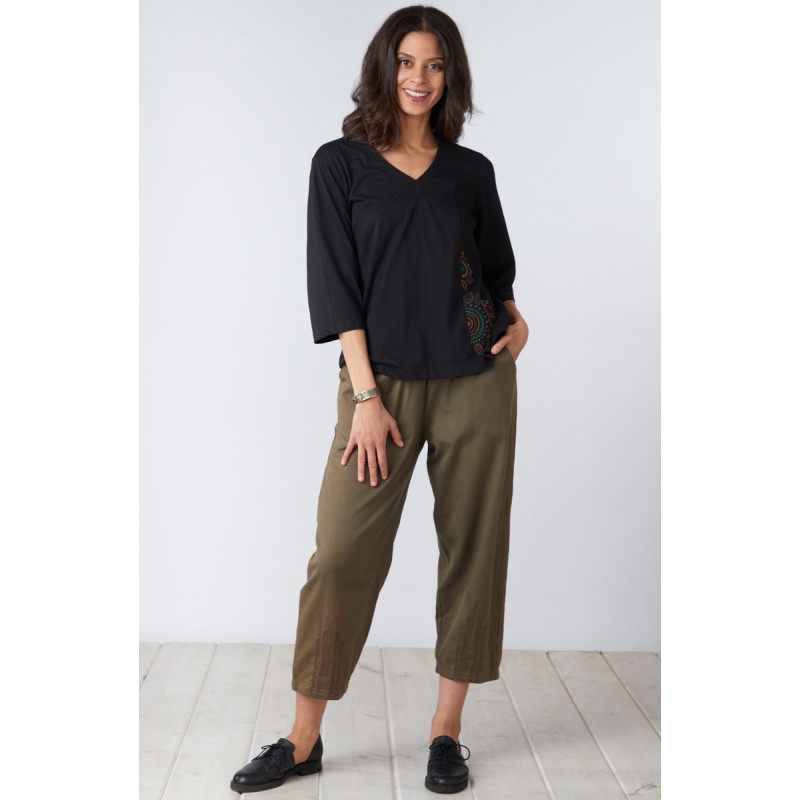 Medium-weight twill flood-length pant with flattering barrel-leg in goes-with-everything woodsy brown. Elastic waist. Tonal embroidery accents at hem.
