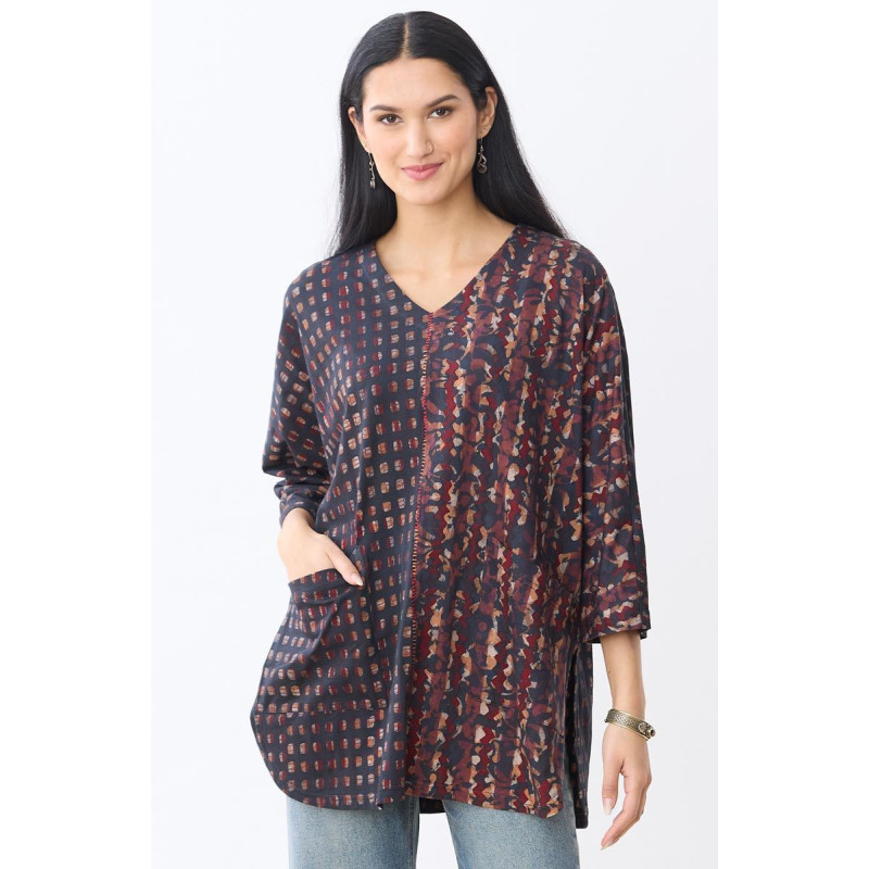 Two batik and block prints in autumn reds, golds and browns combine for this V-neck jersey top. Hand embroidery accents the center seam. Shirttail hem. Three-quarter length dolman sleeves. Generously cut - consider sizing down for a less oversized look