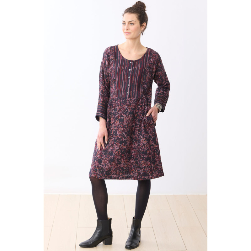 Richly patterned in batik and block handprints of multiples shades of purple plum: our soft and drapey textured cotton crepe dress has dropped shoulders and gentle side gathers. Contrast button yoke and cuffs have hand embroidery highlights on the printed stripes. Three-quarter length sleeves.