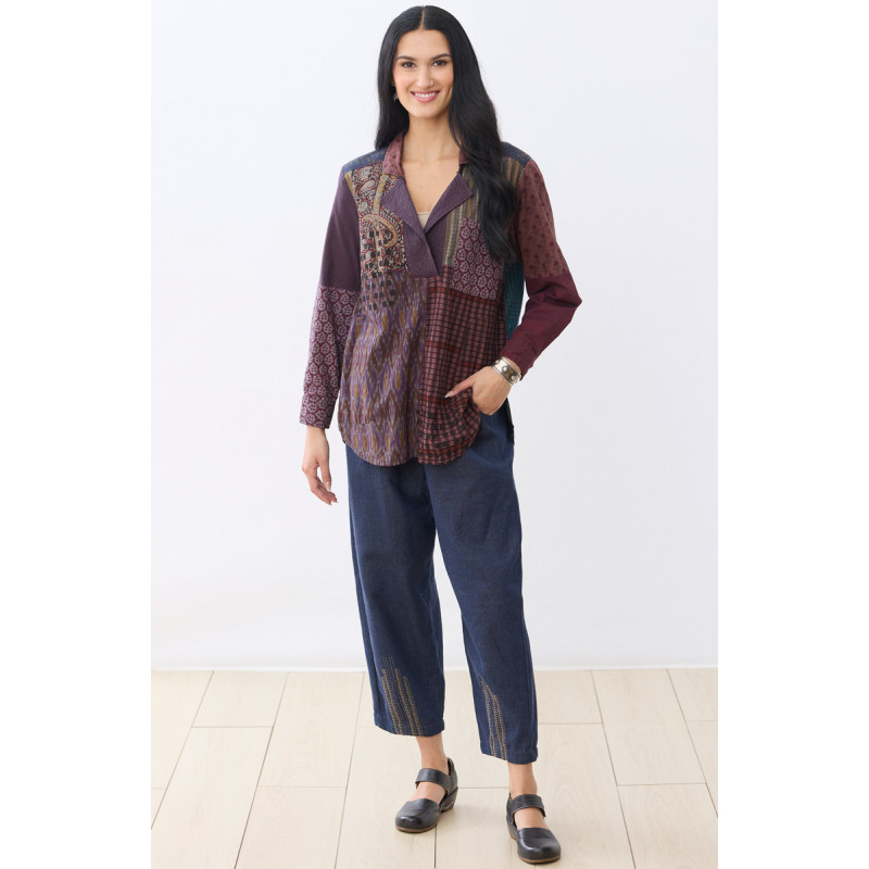 Definitely denim. Our flood-length pant with a flattering barrel-leg silhouette, handwoven with eco-friendly recycled-yarn in a classic denim blue. Designed with an elastic waist for comfort and ease, featuring hand embroidery accents at the hem. A durable and sustainable choice, this pant blends strength and eco-consciousness. The handwoven texture adds a unique artisanal touch, while the incorporation of recycled materials reduces waste.