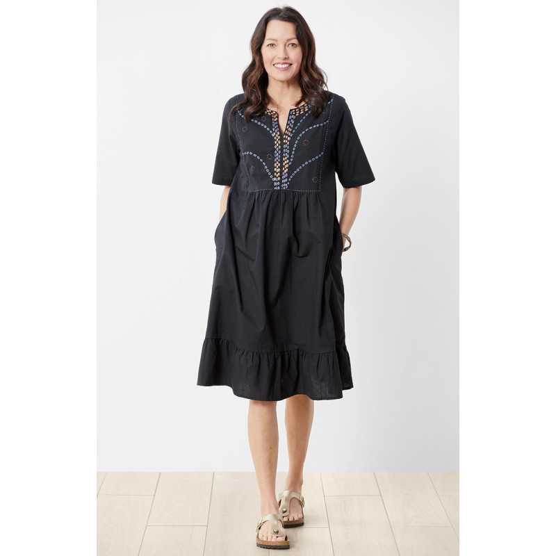 So much to love about this soft organic cotton dress! Exuberant hand embroidery decorates the notch-neck yoke, and gentle gathers at the waist and a bottom flounce give a gentle sweep. Our eco-friendly dress is ready for every occasion.